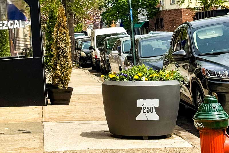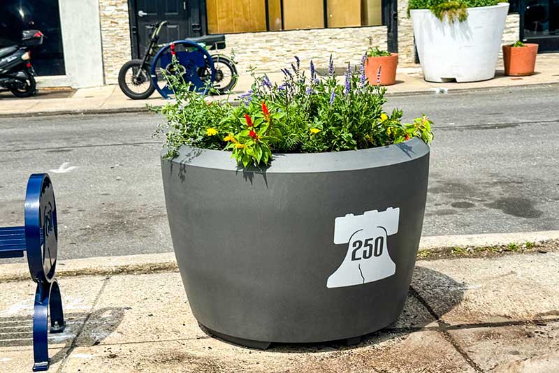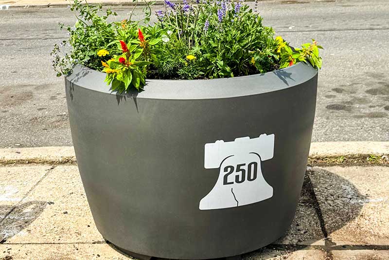 To meet the high demands of Philadelphia’s high-traffic streetscapes during this year of global attention, these planters feature our signature fused-graphic technology. Unlike traditional decals or wraps that can wear or peel in dynamic urban environments, our specialized process embeds the PHL250 branding and Liberty Bell iconography directly into the resin material. The result is a vibrant, permanent graphic that is completely resistant to fading, cracking, and peeling. We are proud to partner with city-wide initiatives that provide durable, beautiful, and permanent branding solutions for streetscapes throughout Philadelphia, ensuring that the spirit of the 250th anniversary remains a permanent part of the urban fabric.