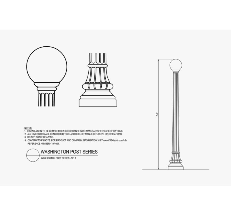 This decorative, fluted, tapered, antique style composite light pole is manufactured to mimic those found in our Nation’s Capital, Washington, DC. In early 20th Century, the bell shaped base design was a prolific eye-catching icon along the streets of DC. This is our tribute to the classical American design. This simple design is a great compliment to any dock, deck, or walkway. The W1 pole has an overall height that is approximately 7′ 6” from ground to the top of the 12” round globe. This set contains: